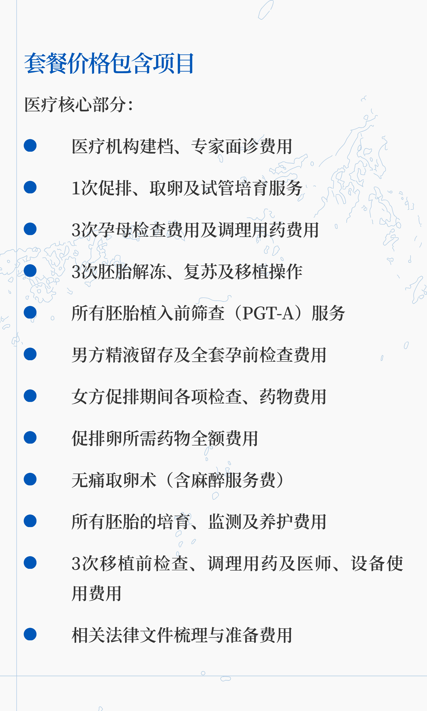 三代一促三移套餐套餐价格包含项目医疗核心部分:医疗机构建档、专家面诊费用1次促排、取卵及试管培育服务3次孕母检查费用及调理用药费用3次胚胎解冻、复苏及移植操作所