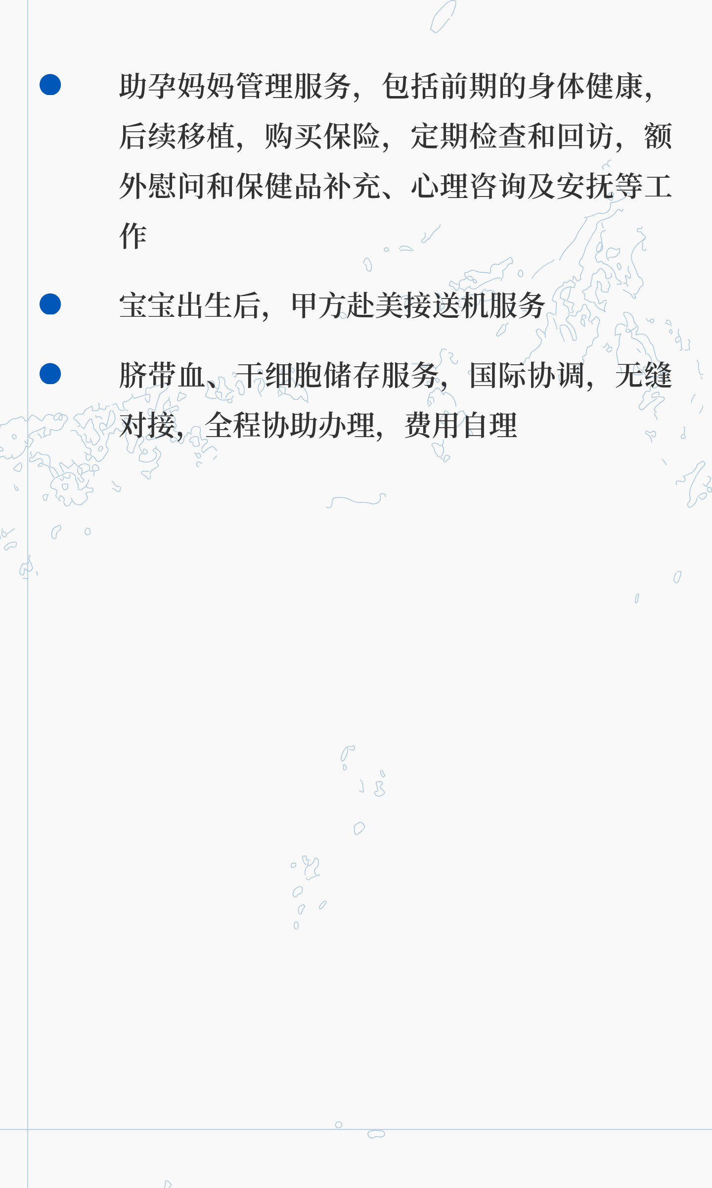 美国试管婴儿孕妈阶段全程服务,涵盖签证、医疗、律师协助及宝宝接送,助孕妈妈管理及脐带血储存全程支持。