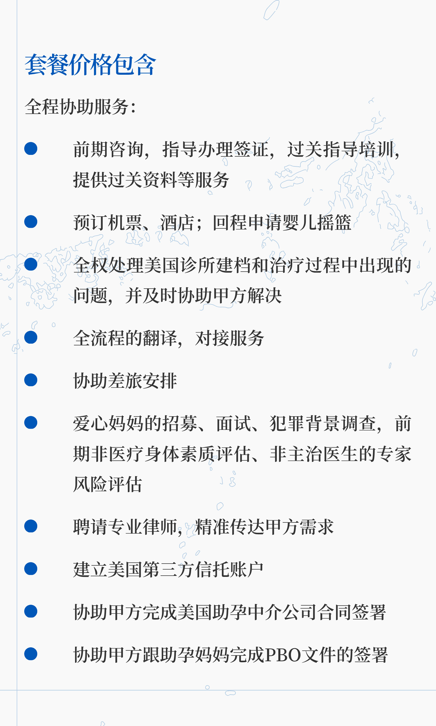 助孕妈妈管理服务,包括前期的身体健康,后续移植,购买保险,定期检查和回访,额外慰问和保健品补充、心理咨询及安抚等工作